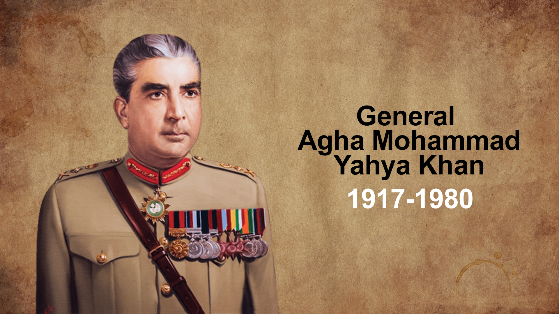 Agha Mohammad Yahya Khan Qizilbash was born in 1917 (Chakwal, West Punjab). Although born in the Punjab, Dari (Classic Farsi) was spoken in his house. After graduation from the Military Academy at Dehradun in 1938, he was commissioned in the Baluch Regiment of the British Indian Army. At the time of partition, he was a Major posted at the prestigious Command & Staff College, Quetta.