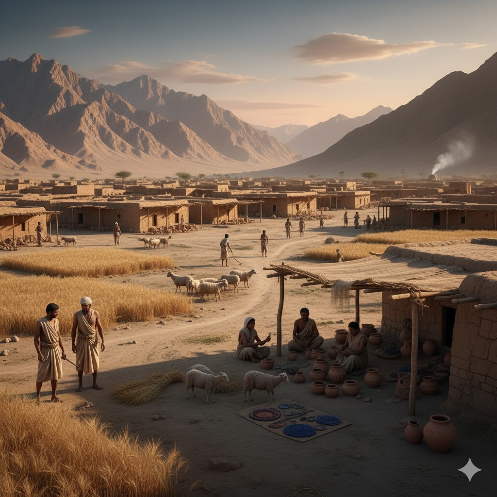 At the foot of the Bolan Pass in Balochistan, Mehrgarh marks one of humanity’s earliest experiments in settled life. Here, agro-pastoral communities cultivated barley and wheat, herded animals, and built with mud brick, laying foundations for craft technologies, ceramics and beadwork that would later underpin South Asia’s urban arcs.